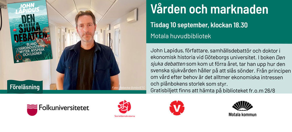 Den 10 september kl. 18.30 (save the date!) så kommer John Lapidus för prata om ”Den sjuka debatten – bland vårdindustrins myter, nyspråk och lögner” på huvudbiblioteket i Motala.Lapidus, som är fors…